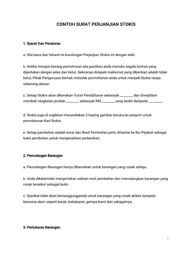 Contoh Surat Perusahaan Perjanjian Kredit Investasi Pasal 6. Setiap Stokis akan menerima Kit Permulaan iaitu Kad Stokis Pamplet Katalog Buletin dan Tester Barangan serta satu salinan Surat Perjanjian Stokis.